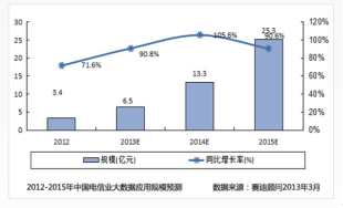 随着以智能手机、平板电脑为代表的新式移动互联网终端的不断推出,人们对于移动互联网业务的需求将呈现爆炸式增长趋势。这种趋势势必将促使电信业不断围绕着面向移动互联网的应用和内容平台转移,以大数据为依托,并走向新的融合为中心的新的时代。受应用推动,未来三年,电信行业大数据应用规模将呈现高速增长,到2015年整体规模将达到25.3亿元,年增长率高达90%以上。